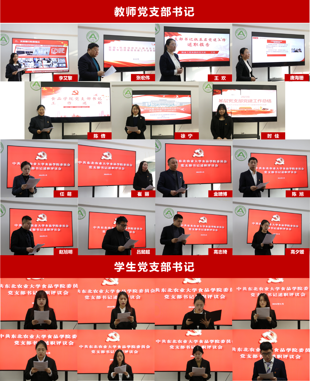 潘俊波对述职情况进行了点评总结,她对各位党支部书记在2023年度党支部建设及党建推动事业发展取得的成效给予了充分肯定,并对2024年党支部工作提出了四点要求。一是要强化理论武装,在提升党组织政治功能上下功夫;二是要规范制度落实,在提升党支部生机活力上下功夫;三是要坚持守正创新,在推动党建和业务融合上下功夫;四是要推进作风建设,在管党治党向纵深落实上下功夫。她强调各党支部要继续围绕“龙江食尚”党建品牌项目,把创新思维和品牌理念融入党支部建设,以融合发展、特色共建为目标,打造各具特色的党支部建设品牌,扎实创建“七个有力”型党支部,推动学院“一融双高”建设再上新台阶。