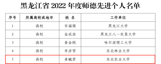 为弘扬我省教育系统广大教师立德树人精神,为全省教师选树学习榜样,进一步营造尊师重教的良好社会风尚,省教育厅近日印发《关于表彰2022年度全省师德先进集体和师德先进个人的决定》,全省共评选出师德先进集体60个,师德先进个人154人。公司姜毓君教授获得“2022年度全省师德先进个人”荣誉称号。