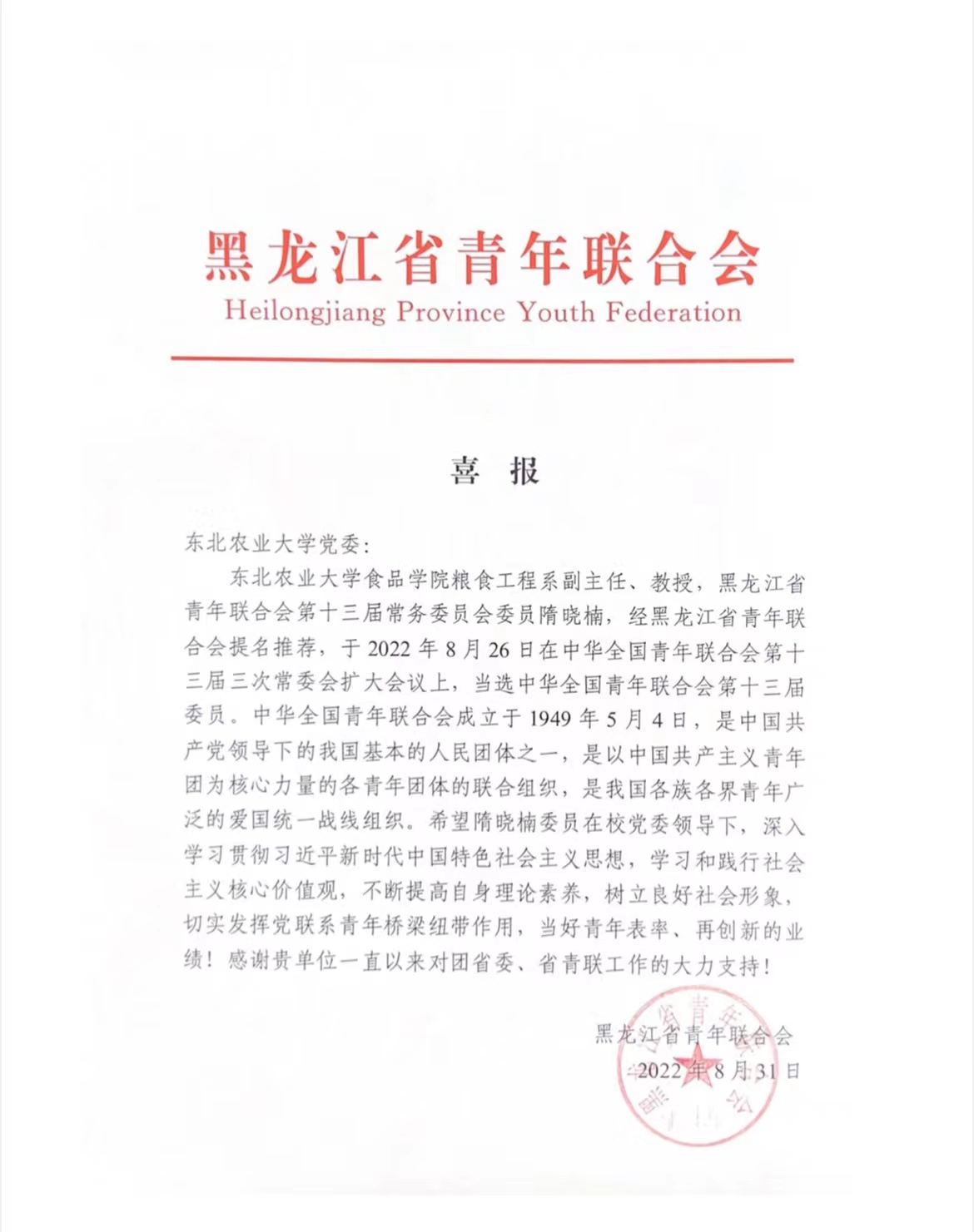 8月26日在中华全国青年联合会第十三届三次常委会扩大会议上,公司粮食工程系副主任、教授、黑龙江省青年联合会第十三届常务委员会委员隋晓楠,当选中华全国青年联合会第十三届委员。