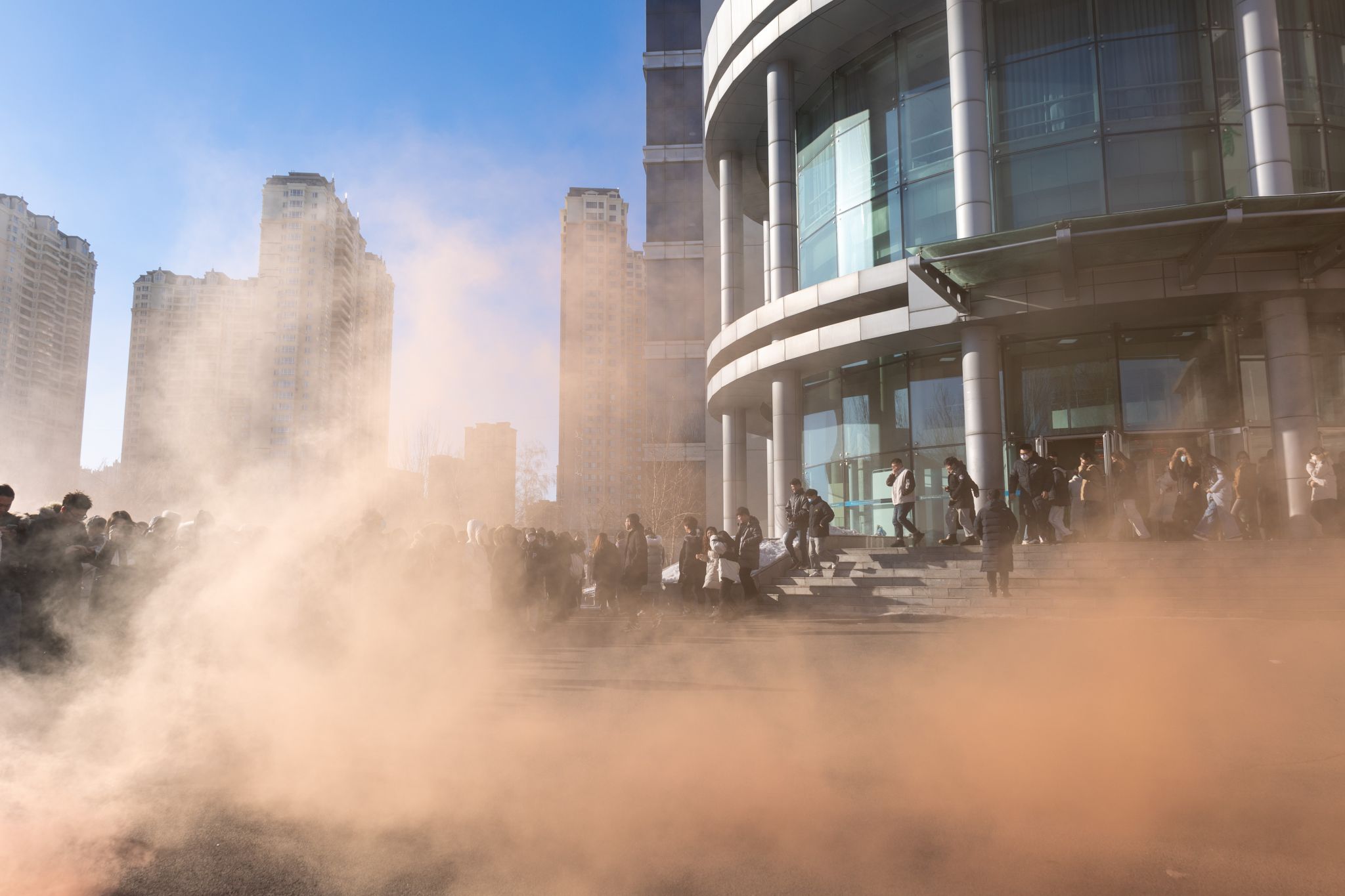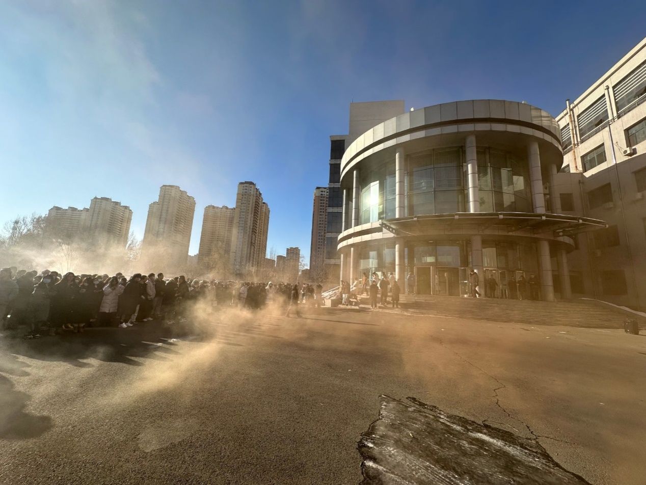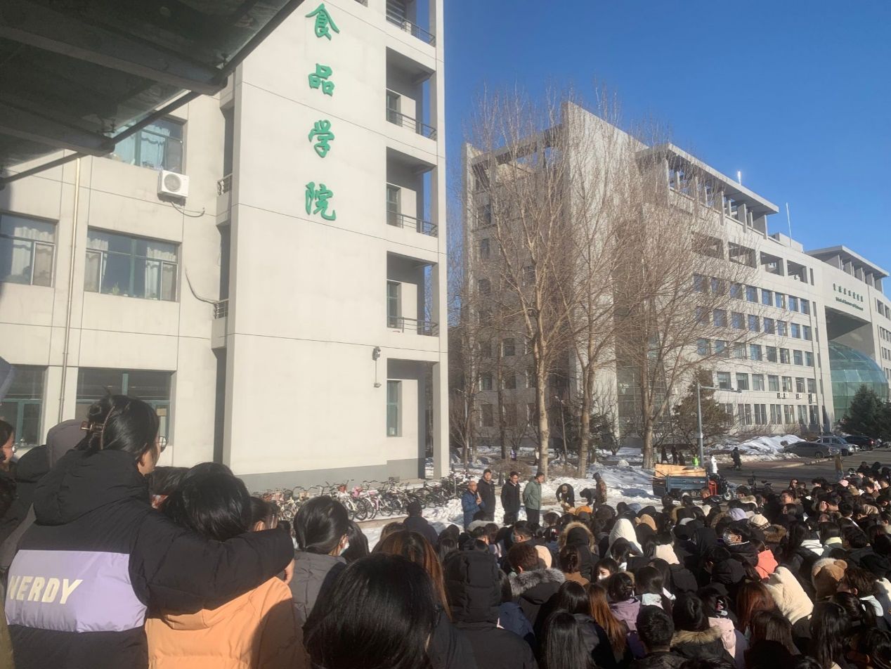 实验内师生在工作人员引导下有序疏散至楼前广场