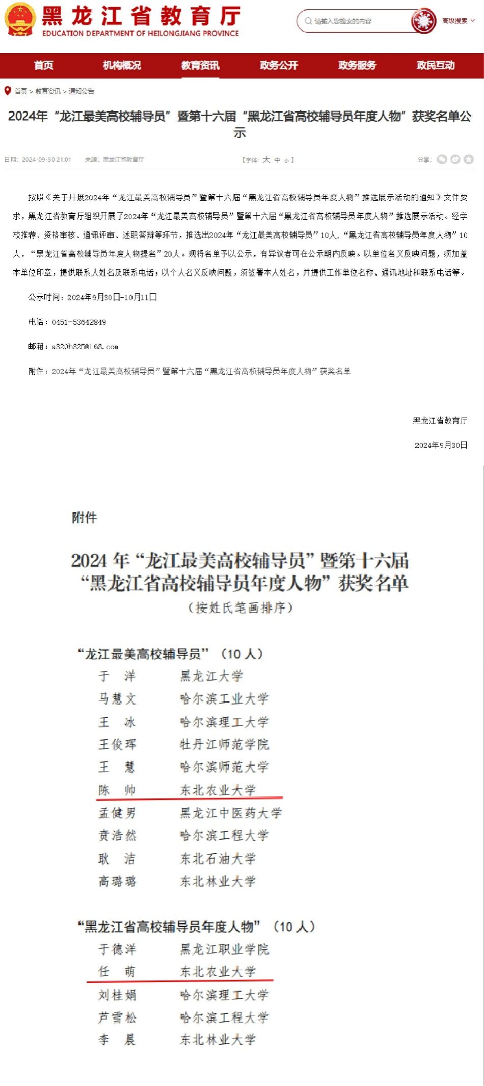 近日,由省委教育工委会同省委宣传部、省教科文卫体工会共同组织开展的2024年“龙江最美高校辅导员”暨第十六届“黑龙江省高校辅导员年度人物”推选展示活动圆满落下帷幕,共推选出2024年“龙江最美高校辅导员”10人,“黑龙江省高校辅导员年度人物”10人。经资格审核、通讯评审、述职答辩等环节的激烈角逐,公司辅导员任萌获得“黑龙江省高校辅导员年度人物”荣誉称号。